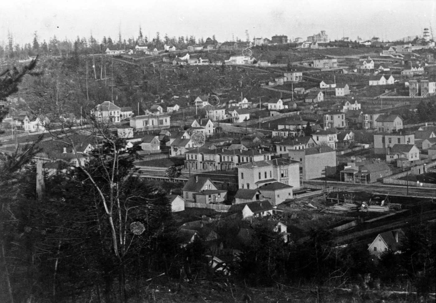 From Denny Hill, a similiar point-of-view – shifted about one block to the right and missing more than one block on the left. The still forested part of First Hill is the steep part between Seneca and Pike, 8th and Terry. It is still steep with, for instance, steps on Union and no thruway for vehicles on University to the east of 9th Ave.