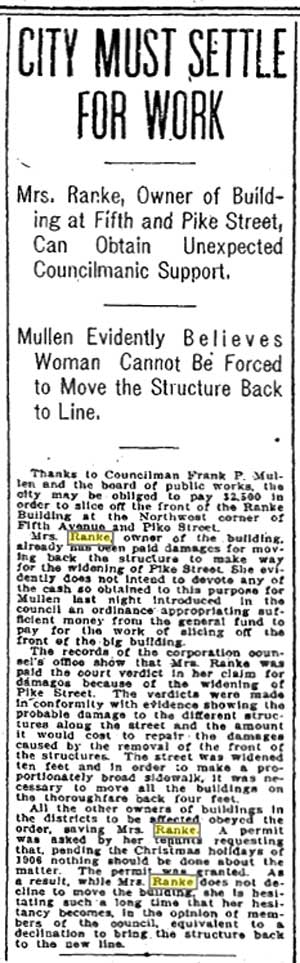 1-7. ST.-3-19-1907-Mrs-Ranke-wants-to-slice-front-of-bldgWEB November 16, 2013 300 × 963 1-7. ST.-3-19-1907-Mrs-Ranke-wants-to-slice-front-of-bldgWEB In its edition for March 19, 1907 The Seattle Times reveals that Mrs Ranke