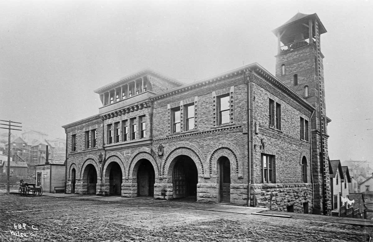 Seattle’s post-1889 fire headquarters at the southwest corner of 7th Ave. and Columbia Street, and so for most of its life – although not in this early Wilse shot form the 1890s – across 7th Avenue from both the Zindorf and Columbia Apartment. (Courtesy Lawton Gowey)