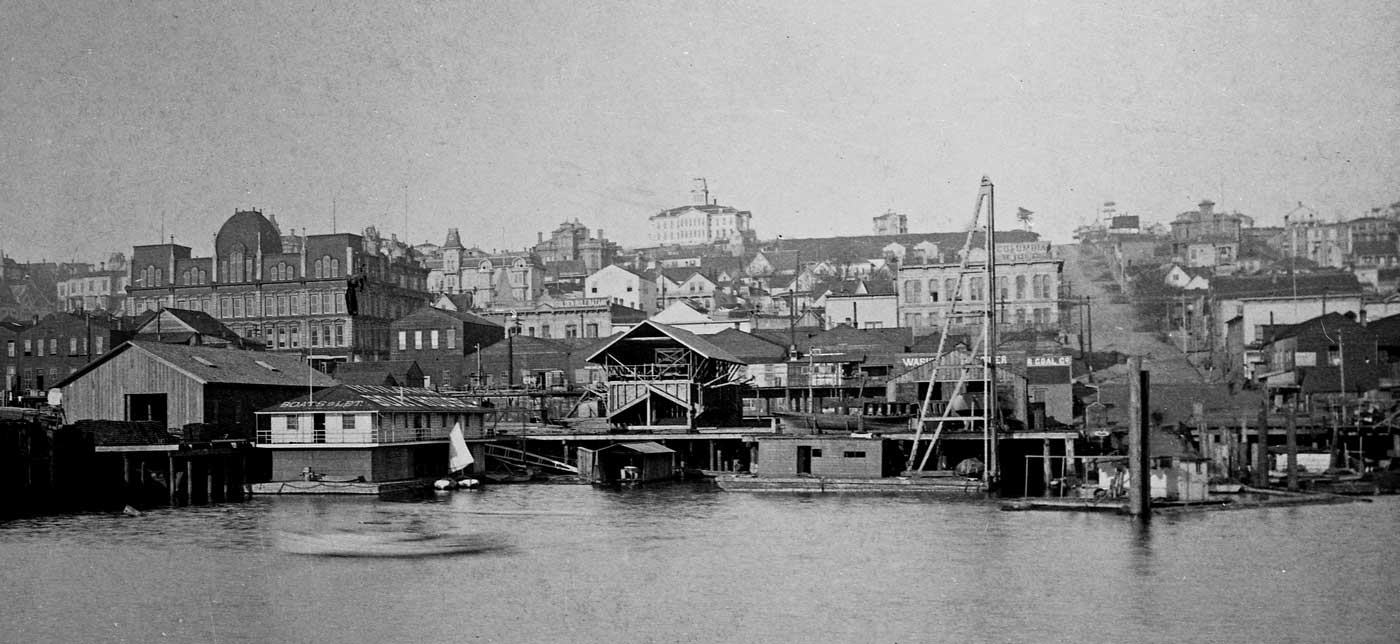 The horizon shows both the first Central School at 6th and Madison, at the center of the horizon, and to its right the upstanding McNaught home at the southeast corner of 6th and Marion. Columbia Street climbs First Hill on the right. Frye’s Opera House, far-left, filled the northeast corner of Front Street (First Ave.) and Madison Street.