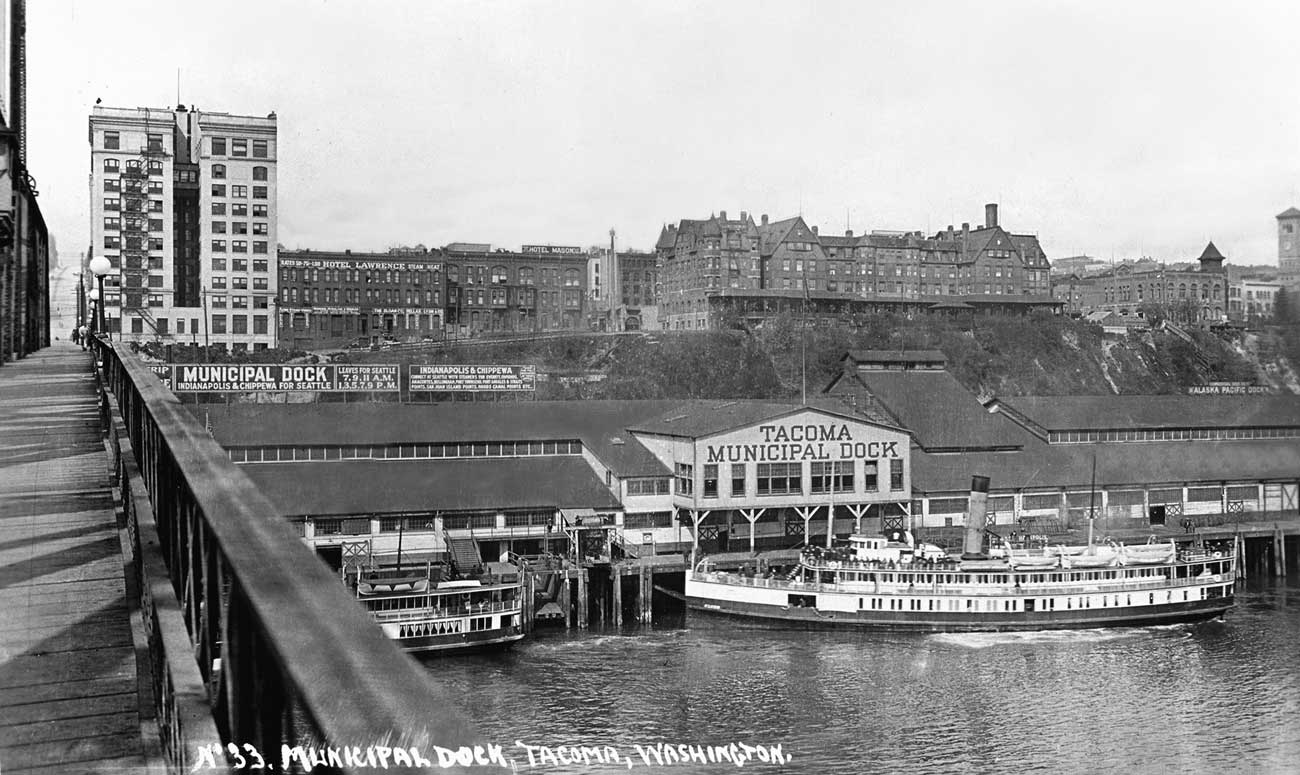 A few Tacoma landmarks as seen from the 11th Ave. Bridge. Far right the Tacoma City Hall tower is cut down the middle. Next to it another tower, that for the fire station, breaks the horizon. At the center is the distinguished Tacoma Hotel, and below it the city’s Municipal Dock, terminus for the Puget Sound “Mosquito Fleet.”