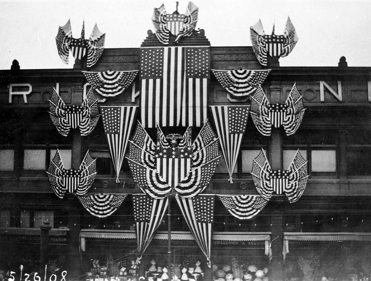 1908-F&N-bunting-WEB November 27, 2011 1200 × 908 1908-F&N-bunting-WEB Frederick and Nelson facing Second at Madison Street, adorned with bunting for the 1908 fleet visit.