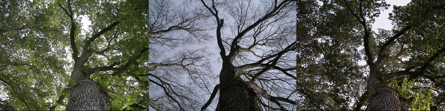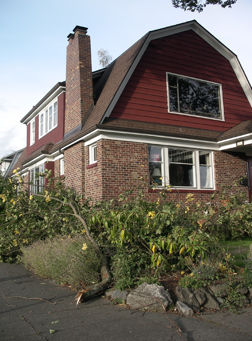 At the Wallingford corner of Eastern Avenue and 42nd Street stand two of the tallest American Elms in Seattle. There are no witnesses to their age and neighbors hope that the rings may never be counted. The trees can be seen prominently from the Ship Canal Bridge on I-5. Together these twins are the largest green mass around. A few years ago the twin to the east began to crack between its two high branches. The owners then of the corner house had a cable run between them. The sudden molesting wind that blew through the north end (at least) on the afternoon of Saturday Oct. 4, did not break the cable, but it did snap a limb from the east landmark and dropped it to the front lawn. About one hundred feet away and heading for the trees to take my several daily photographs of them, I heard the snap and saw the limb fall. If it had held on for a minute more I’d have been standing beneath as I do with the three photographs attached here in a row, looking up the north side of the west elm watching the limb approach me — and just miss me. Find the hole or identify the missing limb when it was still in place in two of the three views. The limb is missing, far right, on the afternoon of Oct. 4 2008. It is in tact, at the center, in the afternoon of Feburary 28, 2007, and also intact, far left, on the afternoon of Oct. 1, 2008. In a fourth photograph at the top the limb is lying on the front lawn of the home at the northeast corner of 42nd Street and Eastern Avenue.