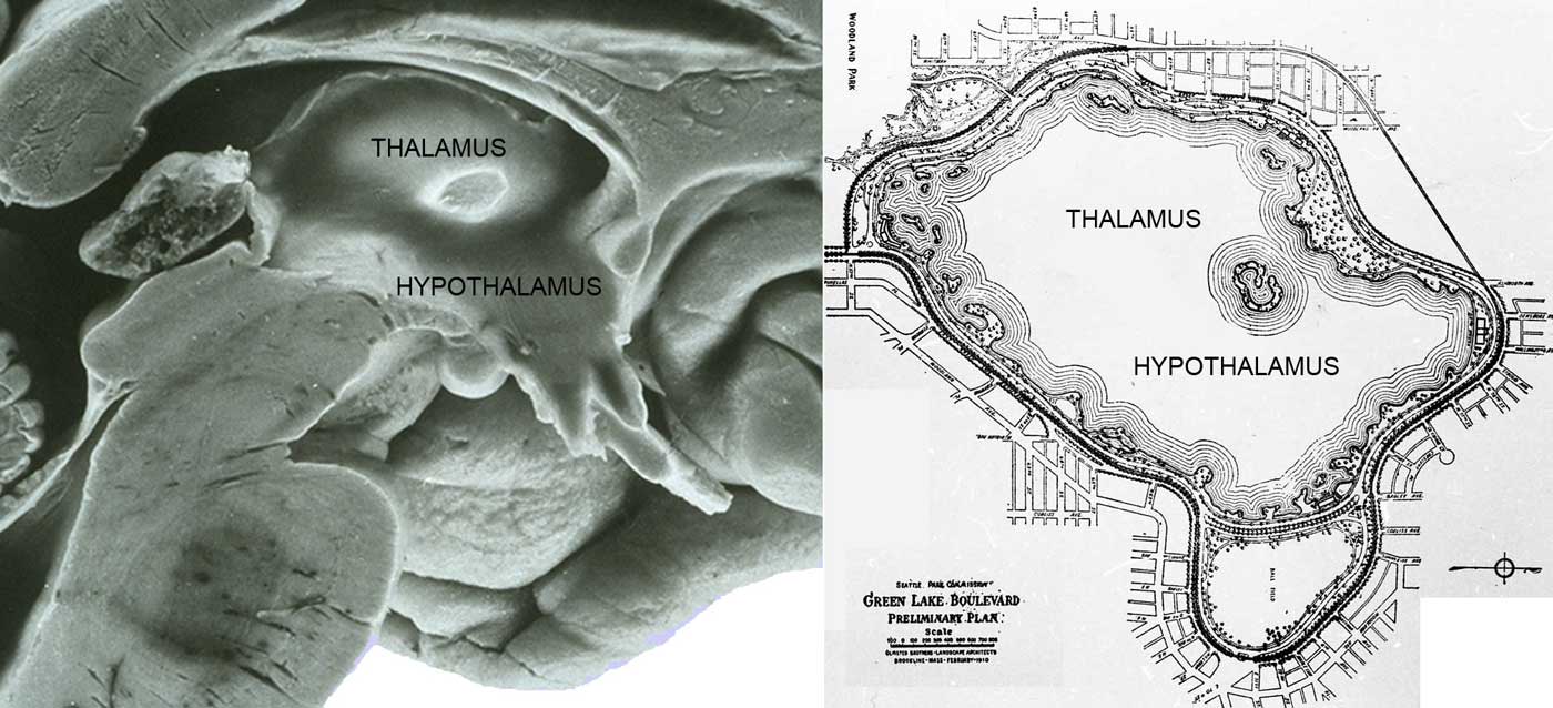 Look carefully and you will see both the Thalamus and Hypothalamus on a midline view of a human brain at the left, and also on the Olmsted’s 1910 Green Lake planning map at the right. You can also see intimations of the pineal (pine cone) gland at the left of the brain’s Thalamus in the bulge at the left on the map. Comes to mind something like the Sherlock Holmes case of the “purloined letters” that were not seen because they were exposed on the table for all to see, so here to the right in the center of the Thalamus sits the shining Massa Intermedia. Imagine the wonderful coincidence. On the map it is Duck Island! Quack Quack!!! It seems to shout. There are other comparisons – certainly more subtle – but we leave those to learned readers who will know that the Hypothalamus is functionally involved with what we call the “Four F’s”: Feeding, Fighting, Fleeing and Sex.