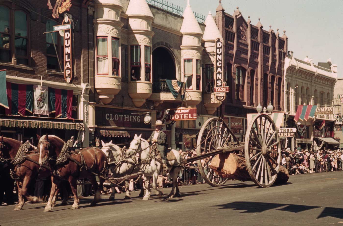 Horace Sykes’ slides include few urban scenes with the exception of celebrations like these of the Pendleton (Oregon) Roundup. The spectacle of horse logging (top) and bareback riding (bottom) are paraded here. I don’t know the year, although there is enough information here to easily determine it if we had ready access to the local library’s Pendleton Room. There’s an imperfect hint on the marquee of the Rivoli. Besides the local “Indian Vaudeville,” which would have been a stage presentation, the theater is showing the who-done-it mystery “Charlie Chan at Treasure Island” (in San Francisco.) The film was released in Sept. 1939. Although this year’s roundup (2010) is also held mid-September, I think it more likely that the Rivoli is showing the Chan film later than 1939. Chan films had legs.