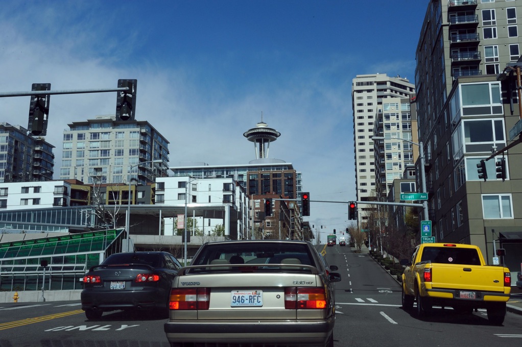 Berangere has sent us four photos of the Space Needle (or in it). She recorded them while touring Seattle with her guide Jean, shown here sitting in the Needle, now 49 years old. We may imagine how a visitor’s vision of the things we know as commonplace is not so tired as our own. For instance, seeing the top of the needle from the waterfront foot of Broad Street is mildly uncanny if you are not inured to the Needle.