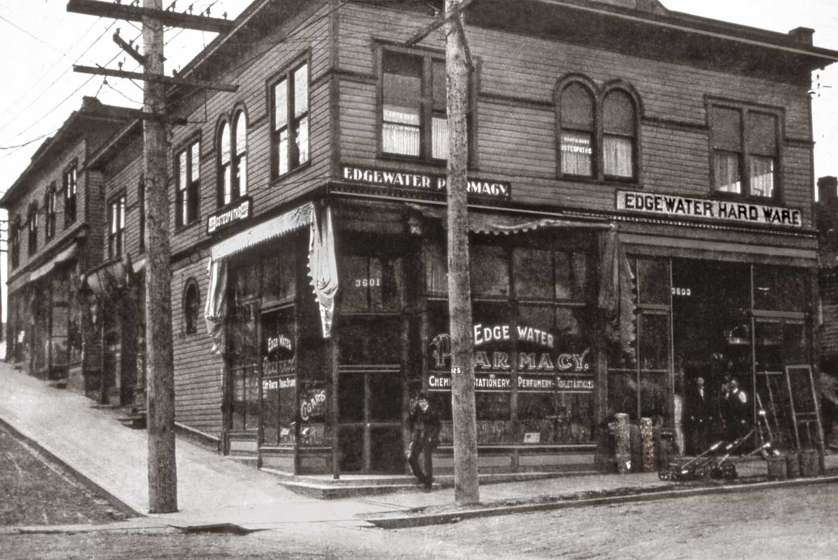 Woodland Park Ave. was improved early in the 1890s to bring the new trolley line north from 34th Street to the southern shore of Lake Union and from there in a counter-clockwise direction following an old logging railroad built just above the lake’s original shoreline. All the structures along Woodland Park Ave. were distinguished and serenaded by the clattering trolleys that ran by them. The neighborhood between 34th and about 40th and to the sides of Woodland Park Avenue was known as Edgewater. (If you wish to make here a key word search you will find other images of its business district at 36th.) Now this strip is variously claimed by Fremont and Wallingford. The names “Freford” and Wallmont” are sometime used in compromise. However, the northern border of this uncertain land grows even more contentious in the blocks north of 45th Street, that is, in Greenford or Wallgreen or Fregreen or Greenmont – depending.