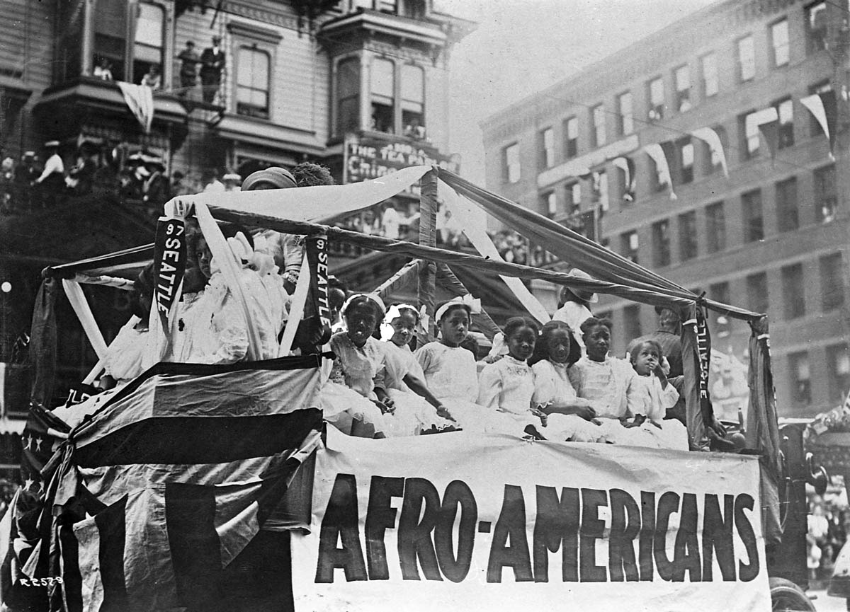 Wisely, Seattle’s Black community arranged their float with girls – the human representatives with the best chance of escaping the grown-up anxieties of racial prejudice. Of course, the reality that awaited them at the end of the parade was the double discrimination held for both black and female. They could return to the love of their own families, but the “big family” would return to making it very hard for them to become anything other than housemaids, nursemaids, cooks, charwomen, or mothers.