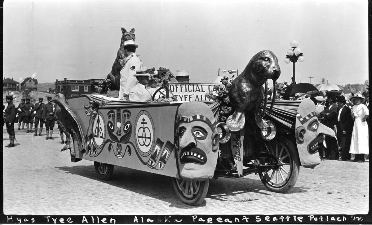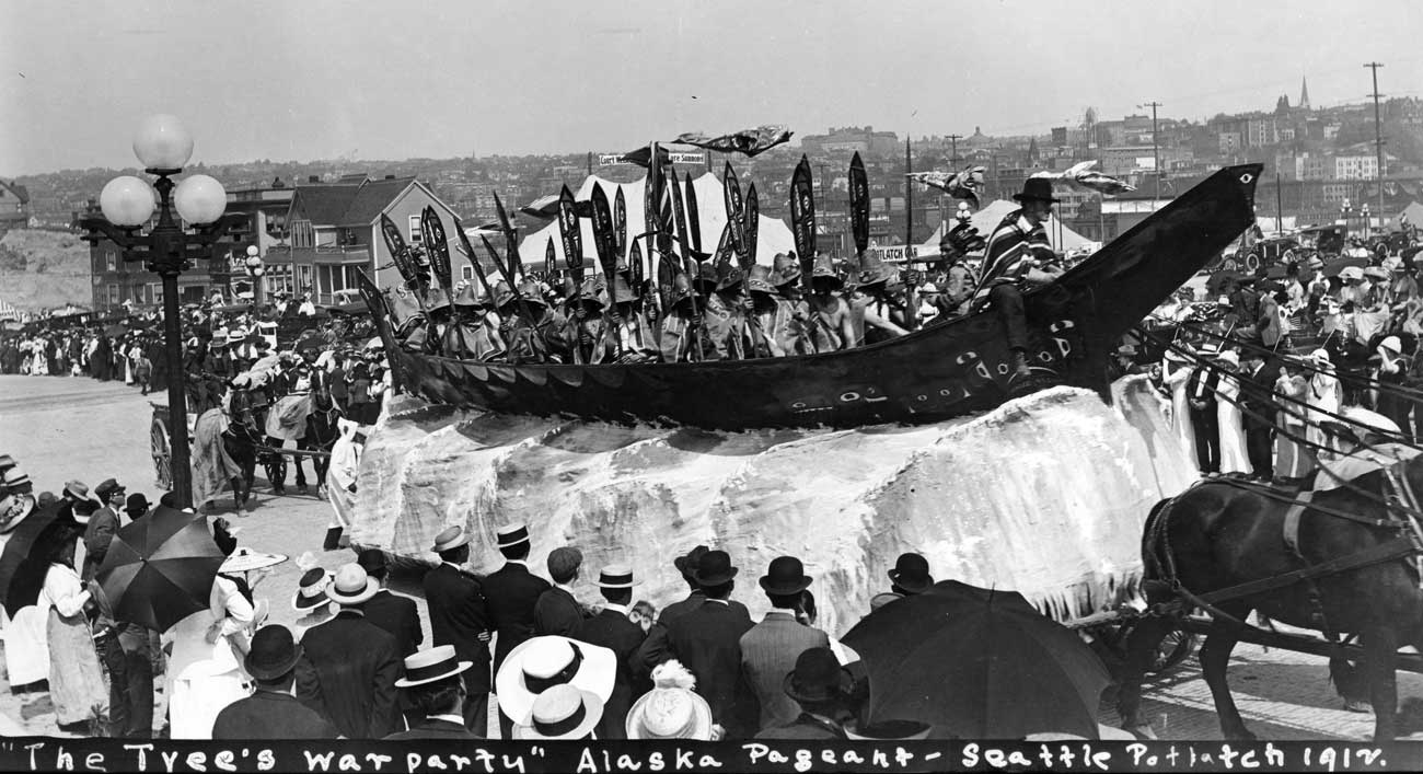 The Golden Potlatch was a local creation hybridized from Seattle’s enduring fixation with the 1897 Alaska Gold Rush (hence, the “97 Seattle” pennants on the float), and the white man’s fascination with the Indian’s ritual of gift-giving called the potlatch. In this spirit, another fair spokesperson, a Reverend Major, advised all citizens to give the gift of “good cheer because it tears down the walls built between us.” The clergyman advised that the Parade of All Nations would show how “Every citizen of Seattle is interested in every other citizen . . . We are a big family.”