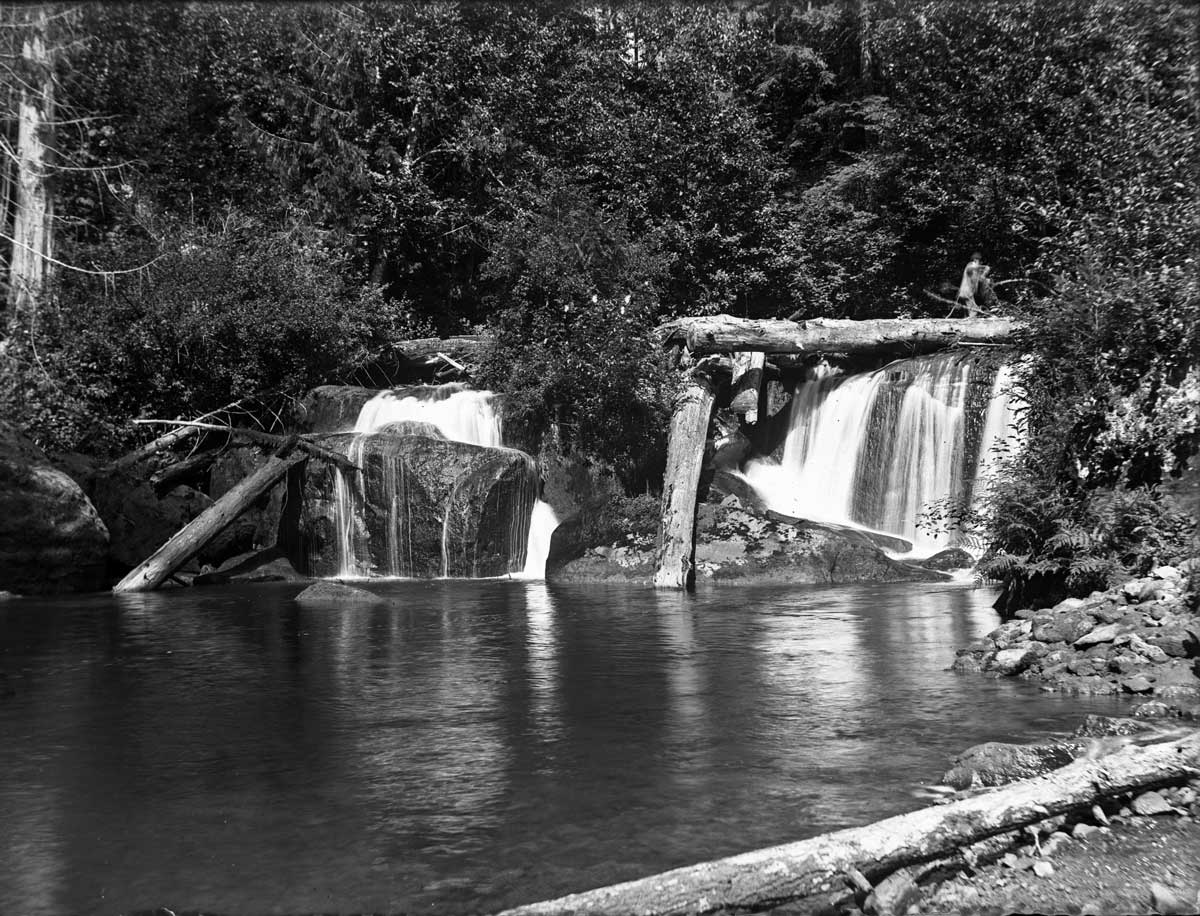 It is now about 40 years since Bill Burden and I last visited Cherry Falls on Cherry Creek in the Cascade foothills northeast of Duvall. It was Larry “Jug” Vanover who first led me to the falls. Bill, I think, was not along on the first visit. Without a guide it would have been hard to find even with good written instructions. There were many splits and turns in the road that wound up at a gate that was sometimes closed and sometimes not. The last leg required a hike down the overgrown bed of a long abandoned logging railroad to the falls which splashed in a pool that was so shaded that even on the hottest visits the water was bracing. It was, however, a splendid place for Diana and her stags. I did some filming there for the Sky River Rock Fire film, which is now also a 40-year work-in-progress. We visited the pool perhaps a half dozen times after Vancouver’s first help in the summer of 1968. He guided us to the falls following that Spring’s Piano Drop, which was staged on Larry’s perfect (for dropping a piano from the sky) property. Of the piano drop I have both film and stills, but of the falls only film. The subject attached here is unidentified. Although it resembles Cherry Falls – as I remember it – I doubt that it is Cherry Falls. Estimating the height of the man standing on top of the falls to the right, (in this circa 1912 glass negative) these falls might be sixteen or so feet high. I think Cherry Creek falls is somewhat higher. In the late 70s Bill Burden and I with an entourage of innocents in two cars tried to find the falls without Larry’s help. We failed. Perhaps next summer we will try again, but first call Larry.