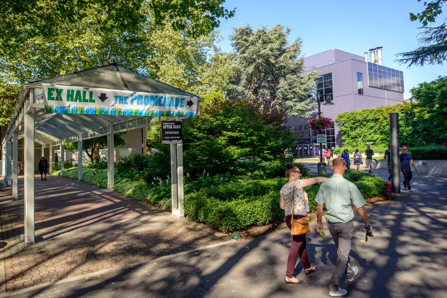 Here looking northeast over Freedom Way, aka Republican Street, this eccentric home's full name was more revealing: the Century 21 Plywood Home of Living Light. It sat on a Center site that has been variously used during the now 40-plus years of Bumbershoot, most often for one of the festival's smaller stages. Sometimes this lawn immediately south of the Exhibition Hall and contiguous to one of the fairs food fairs was free for sprawled eating serenaded by buskers and jamers. Jean's Bumbershoot 2012 repeat reveals an unusually quiet setting on this lawn directly south of the Exhibition Hall. At some point - not remembered here - the covered promenade on Third Avenue (running north-south between the International Fountain and the west end of the Memorial Stadium) was extended thru the site where once shown "living light."