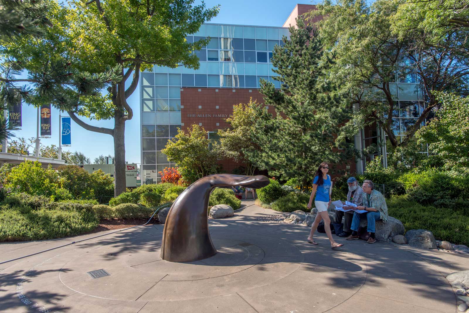 By now one of Seattle’s most cherished landmarks, the Seattle Mural is Paul Horiuchi’s daring glass tile departure from the exquisite collages he constructed from soft and translucent materials like rice paper. While it is now called simply “The Seattle Mural” I imagine it as the Buddhist’s “well-packed region” that is everything – eventually. Follow any line through the mural and eventually – or ultimately – you will end up where you began, and then keep going. Have you sat in the grass for a concert there and wound up wondering through the mural?