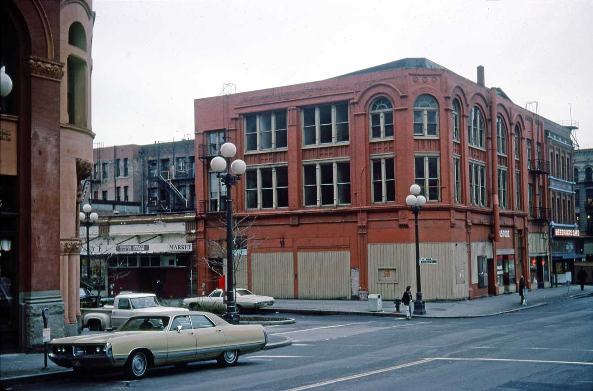 Until their internment during the Second World War, this was a neighborhood where Japanese Americans integrated with Seattle’s Jewish community and a miscellany of many others. Here on the corner is Beckerman’s Delicatessen, also a Jewish center where, for instance, in the spring of 1926 one could pick up tickets for the famous singing cantors Mordecia Hershman and Zavil Zwartin appearing in concert at the Masonic Temple at Harvard and Pine. Across Yesler Way and out of frame to the far right was the synagogue for the Bikur Cholum Congregation, now home for the Langston Hughes Performing Arts Institute.