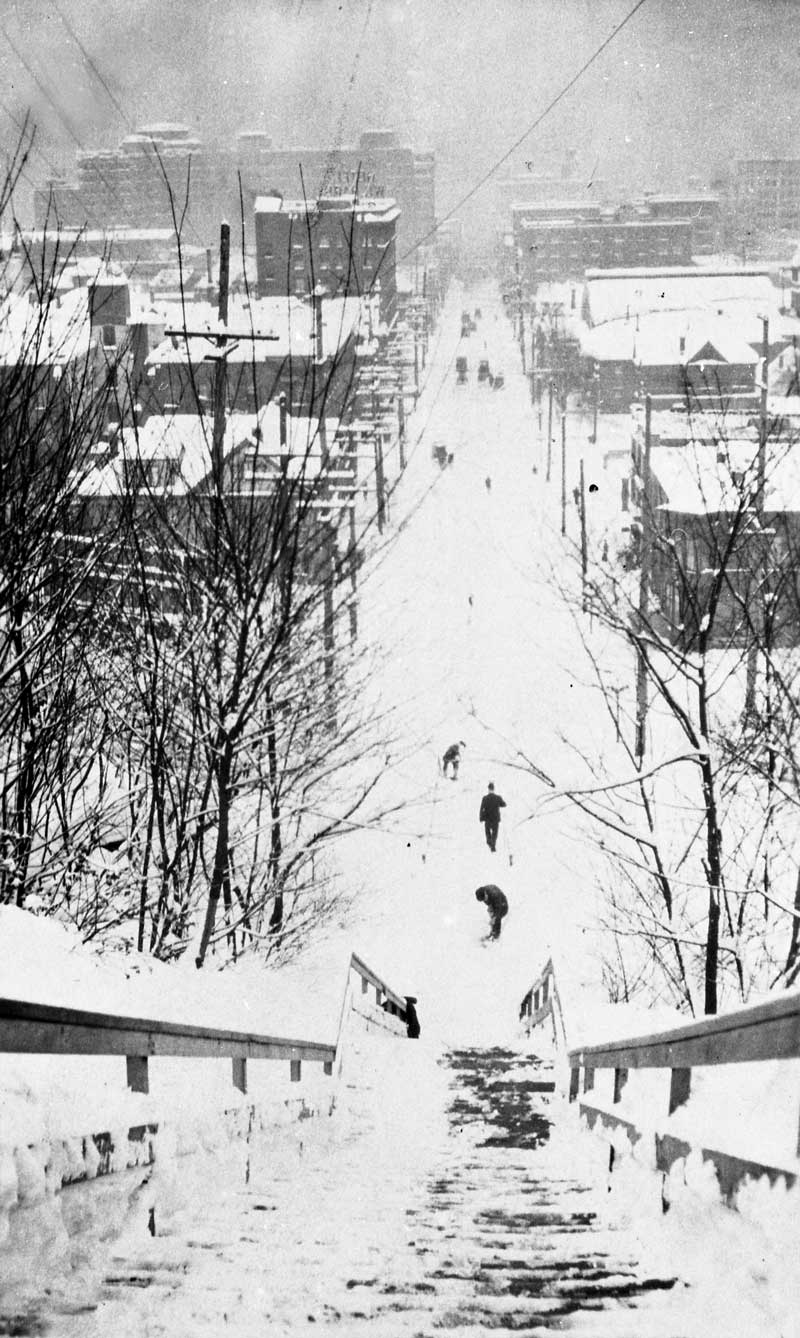 5.-1916-snow-looking-west-from-top-of-Union-WEB March 9, 2014 800 × 1338 Seattle Now & Then: Unitarian Drama With her or his back to Terry Avenue, the photographer looks west on Union Street during the “Big Snow” of 1916. Note the switch-back path.
