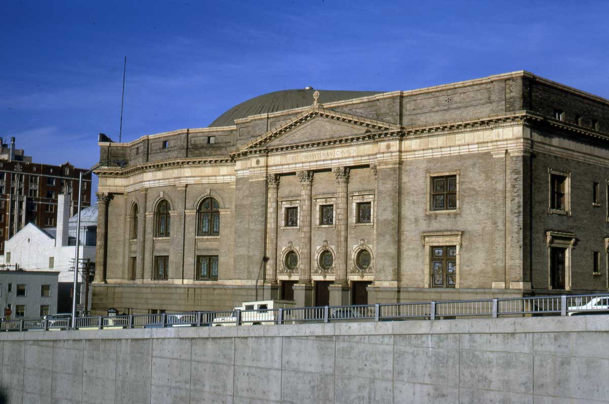 The third of four First Presbyterian sanctuaries, and the first one built on the east side of Seventh Avenue, between Madison and Spring streets. Lawton Gowey recorded this on Feb. 6, 1967, the year and winter season that the Seattle Freeway was dedicated. Gleaming west facade of the Christian Scientists (now Town Hall) at the southwest corner of 8th and Seneca, appears far left. Behind it is the Exeter House, at the northwest corner.