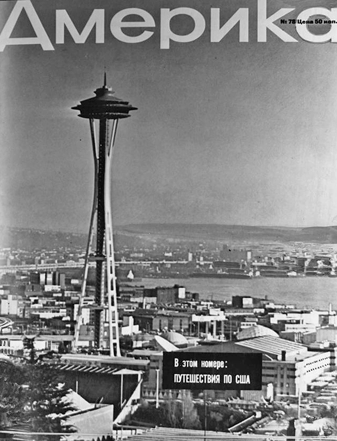 Space Needle, U.S.A.: A panoramic view of Seattle dominated by the Space Needle, is featured on the cover of America, published by the United States Information Agency for distribution in the Soviet Union. The color photograph was taken by Josef Scaylea, The Times chief photographer, during the World’s Fair.