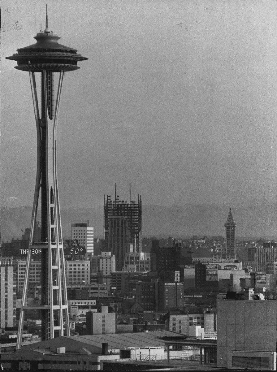 Three prominent landmarks-the Space Needle, the new Seattle-First National Bank building and the Smith Tower-were dominant on the skyline in this photo from Queen Anne Hill. The 50-story Seattle-First structure, to be completed early next year, will be the city’s tallest structure, at 609 feet. The Space Needle’s flame is 600 feet above the ground, and the Smith Tower is 500 feet (42 stories) tall.
