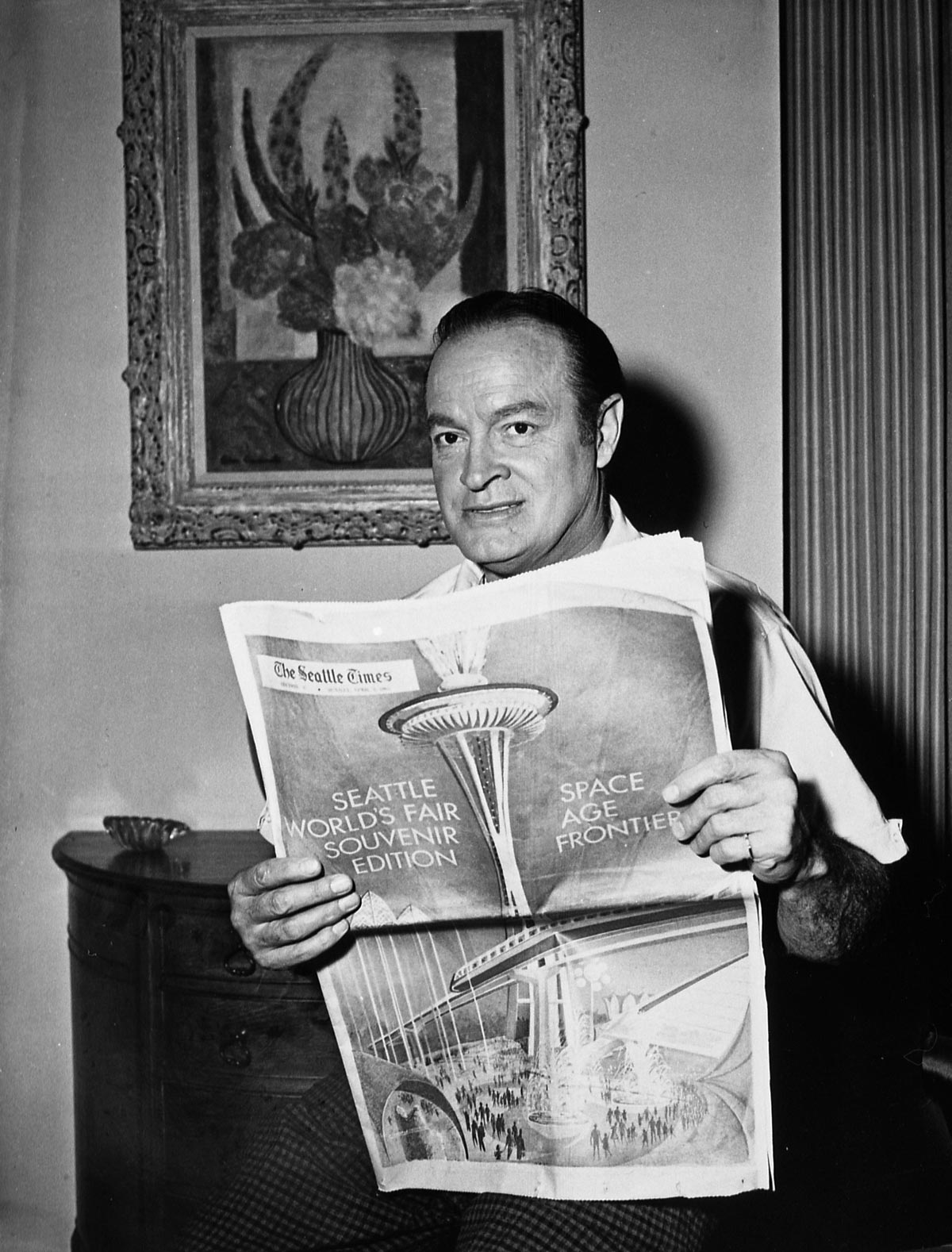 z. bob-hope-with-space-needle-newspaper April 6, 2014 1200 × 1578 Seattle Now & Then: Two Views from the Needle (or, A Stitch in Time) Bob Hope diverted from reading about the fair and its splendid Space Needle.