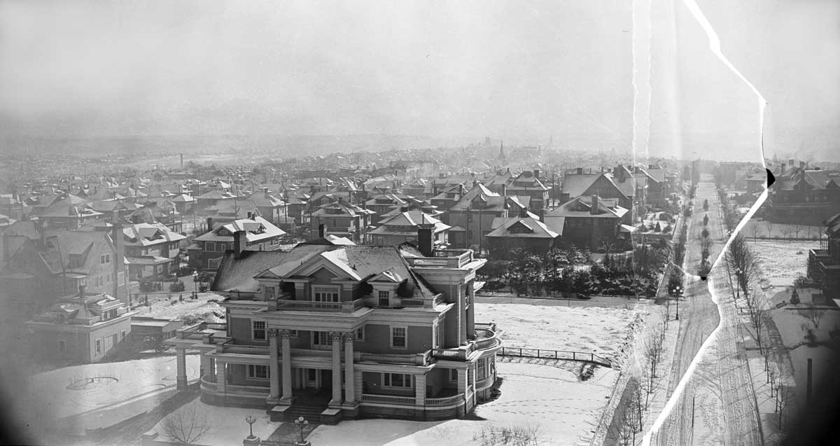Damaged snow shot of Capitol Hill from the Volunteer Park standpipe. The Parker home at the southeast corner of E. Prospect Street and 14th Ave. E. fills the foreground. With its early 20th Century creation by super-developer James Moore, 14th Ave. here south of the park was also known as “Millionaire Row.”