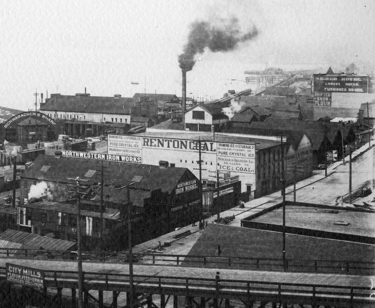 Recorded from a back window of the Arlington Hotel, the subject looks northwest across the University Street viaduct to the industry to either side of Western Avenue and Railroad Avenue, circa 1899. The Schwabacher Dock, far left, face Railroad Avenue. Next to it is an earlier version of the Pike Street Wharf, soon to be replace by what we still have as the city’s aquarium.