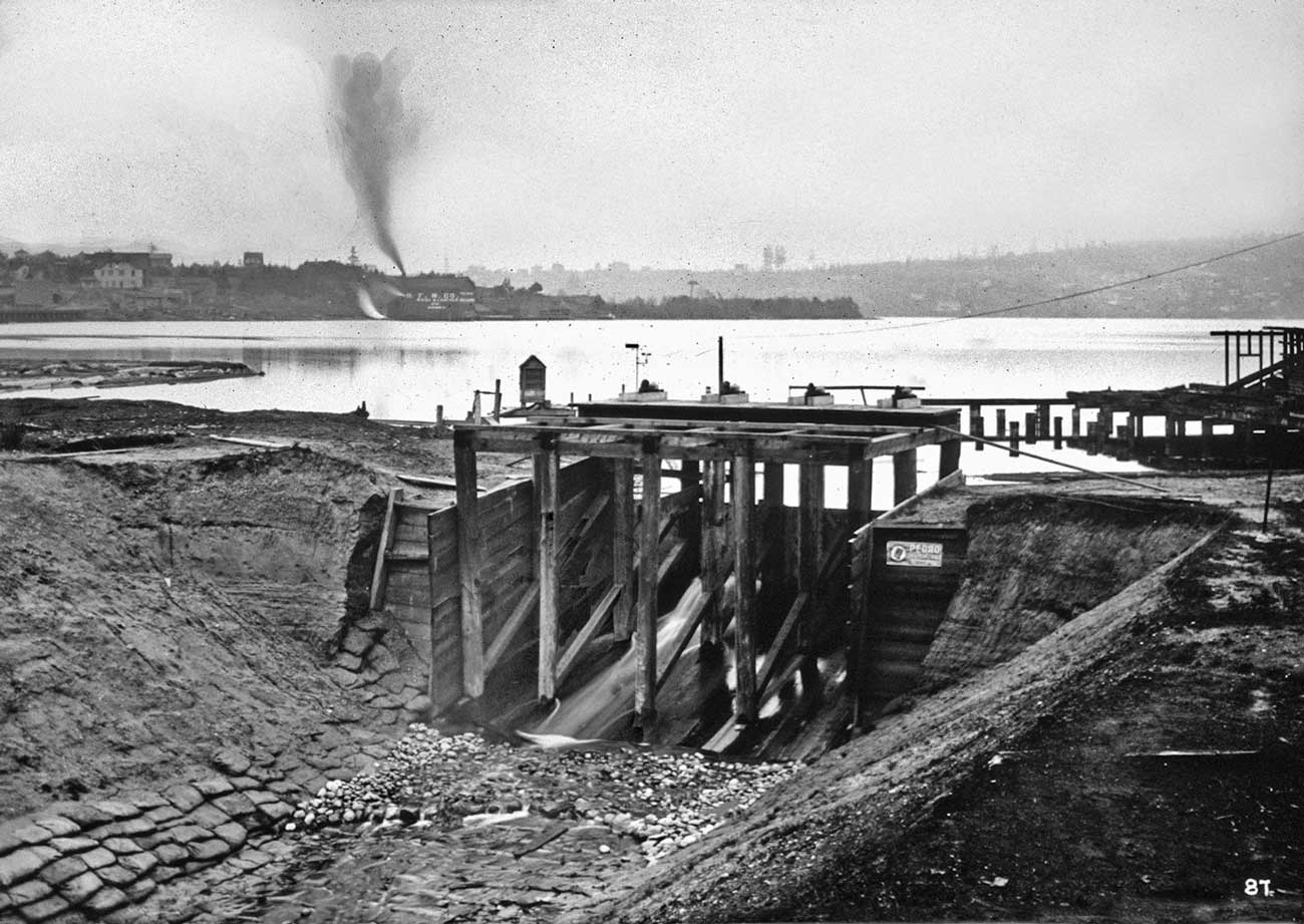 Improvement on the Fremont Dam ca. 1903, looking east to the “Wallingford Peninsula” where the gas works were implanted in 1907. Note the view of the dam directly below from 1907. The gas works can be found along the north shore of Lake Union. [Courtesy, Army Corps]