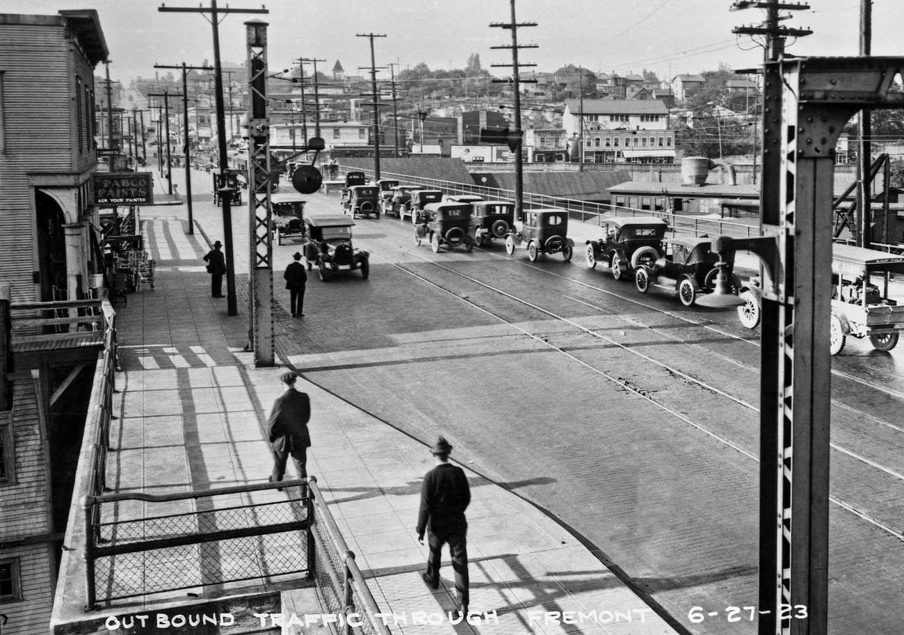 7.-1923,-July-27-Brdge-outbound-Traffic-WEB. June 8, 2014 1300 × 913 Seattle Now & Then: The Lake Union Dam Washout Until the Aurora Bridge was completed in 1932, the bascule at Fremont was busy enough to be considered the busiest bridge of its kind in the U.S.A.. With the University Bridge it was one of the two primary funnels into the north city.
