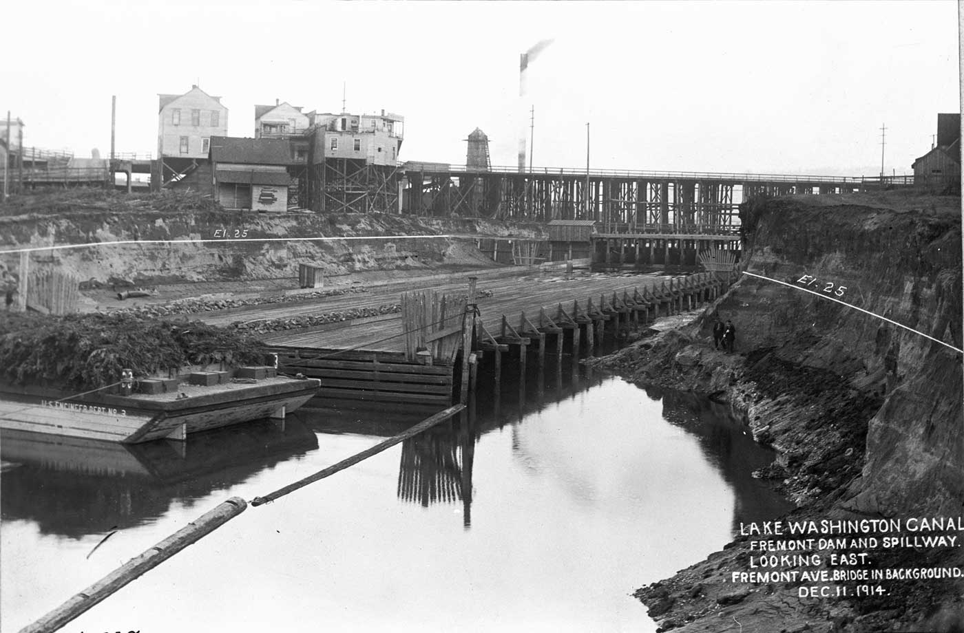 xx. 1914, Dec. 11, Fremont-SPILLWAY-op-side-1914-WEB June 8, 2014 1400 × 920 Seattle Now & Then: The Lake Union Dam Washout A record of the spillway from the Queen Anne side, with lines drawn indicating the expected level of the canal once the locks are closed and the canal is flooded. [Courtesy, Army Corps]