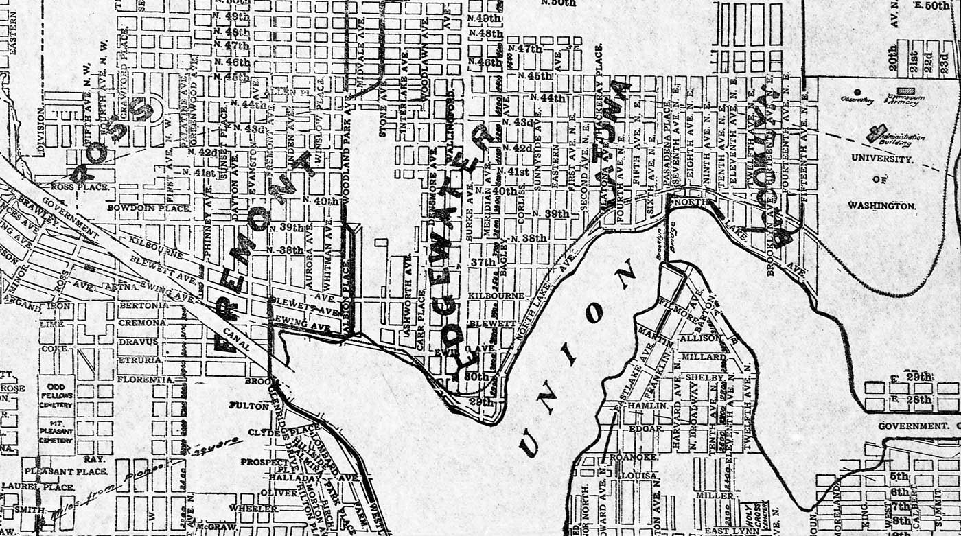 We have shared this north end map before. This detail shows that in the late 1890s the neighborhoods north of Lake Union included Fremont, Edgewater, Latona, and Brooklyn. The last was not abandoned until well into the 20th century. Now it is always University District. But then Latona, Edgewater and Ross, far left, as hardly heard either.