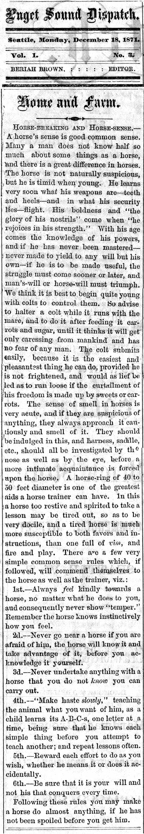 H – Horse-Breaking-ST-12-18-1871-WEB July 27, 2014 500 × 2890 Seattle Now & Then: When the Circus Came to Town Most like another EDGE CLIPPING, this instruction on how to handle a horse was printed first in the Puget Sound Dispatch for December 18, 1871. CLICK TO ENLARGE