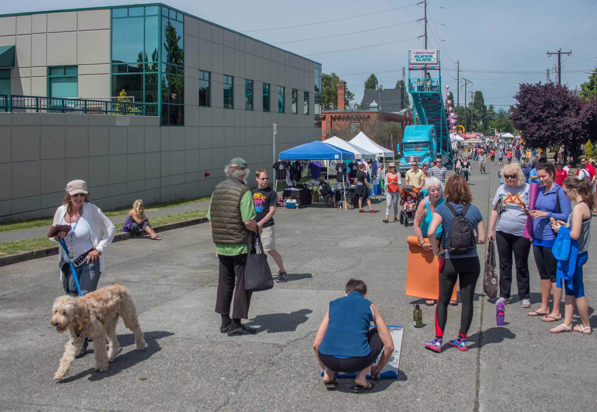 NOW: For his “repeat” Jean stepped into the street to reveal, above the Fremont Fair booths at the scene’s center, the northeast corner of the surviving Fremont Car Barn. Since 2006, it has been a factory for Theo Chocolate, where the confectioner prepares “organic and fair-trade” sweets.