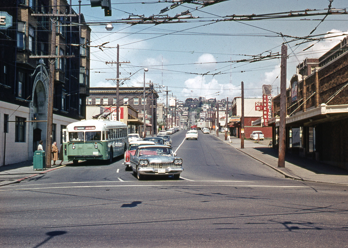 Here too we look north on First Avenue North thru Denny Way. The Ankona is on the left, and here too Lawton has not dated his slide – unless he has and I missed it. (That seems more likely.) Here the traffic is two way, but not so in the Gowey slide directly below.