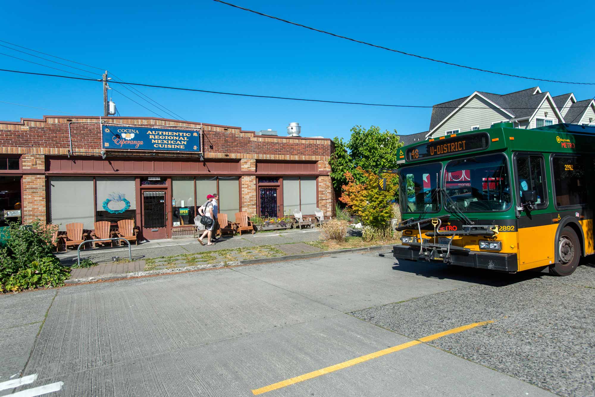 NOW: The city purchased the Loyal Heights trolley line in 1918, and then in 1923 purchased Golden Gardens Park. The distinguished brick business block at the southeast corner of 32nd Ave. NW and NW 85th Street was built in 1928 and is home for both the Caffe Fiore, at the corner, and seen here across Loyal Way, since 2003 the also popular Cocina Esperanza.