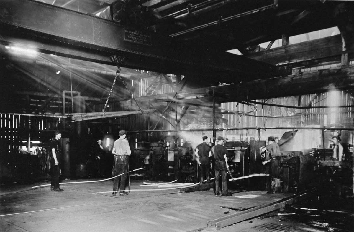3.-1910-plant’s-12-inch-rolling-mill.-reroling-old-rr-rails-into-streel-for–reinforcing-concreteWEB August 30, 2014 1200 × 789 Seattle Then & Now: The Youngstown Steel Mill This dark interior of the early plant’s 12-inch rolling mill dates from about 1910. We can imagine the mix of warm light from the furnaces with the cool blue light falling from the mill’s high windows.
