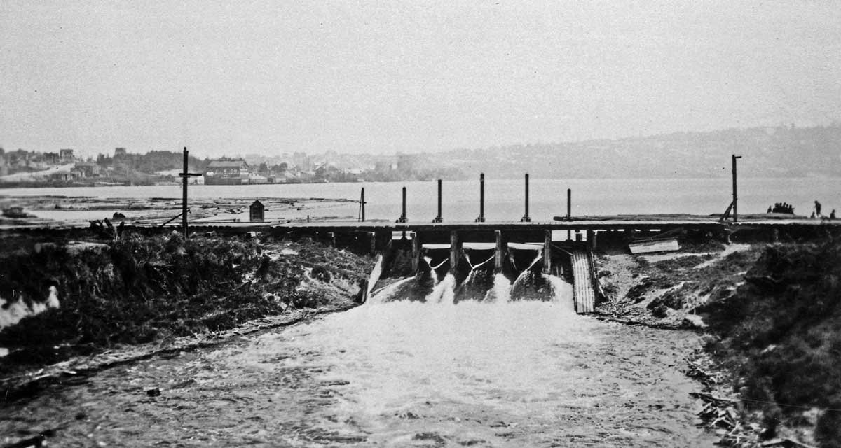 Looking east from the Fremont low bridge (one of them) to the dam at Fremont – the one that gave way in 1914. (Use the keyword search box to find the recent feature about that wipe out.) This view dates from 1906 or 1907, and appears in the same Seattle Gas album (courtesy of Mike Maslan) as the featured photo at the top and a few more below.