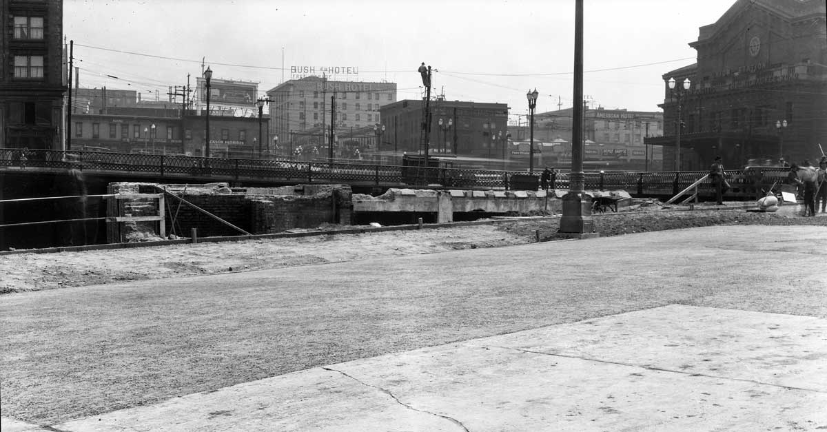 ext. Second-ave-extension-lk-e-w-pavementWEB September 14, 2014 1200 × 627 Seattle Now & Then: Third Avenue South Late work on the Extension looking east-southeast with the Union Pacific depot on the right.