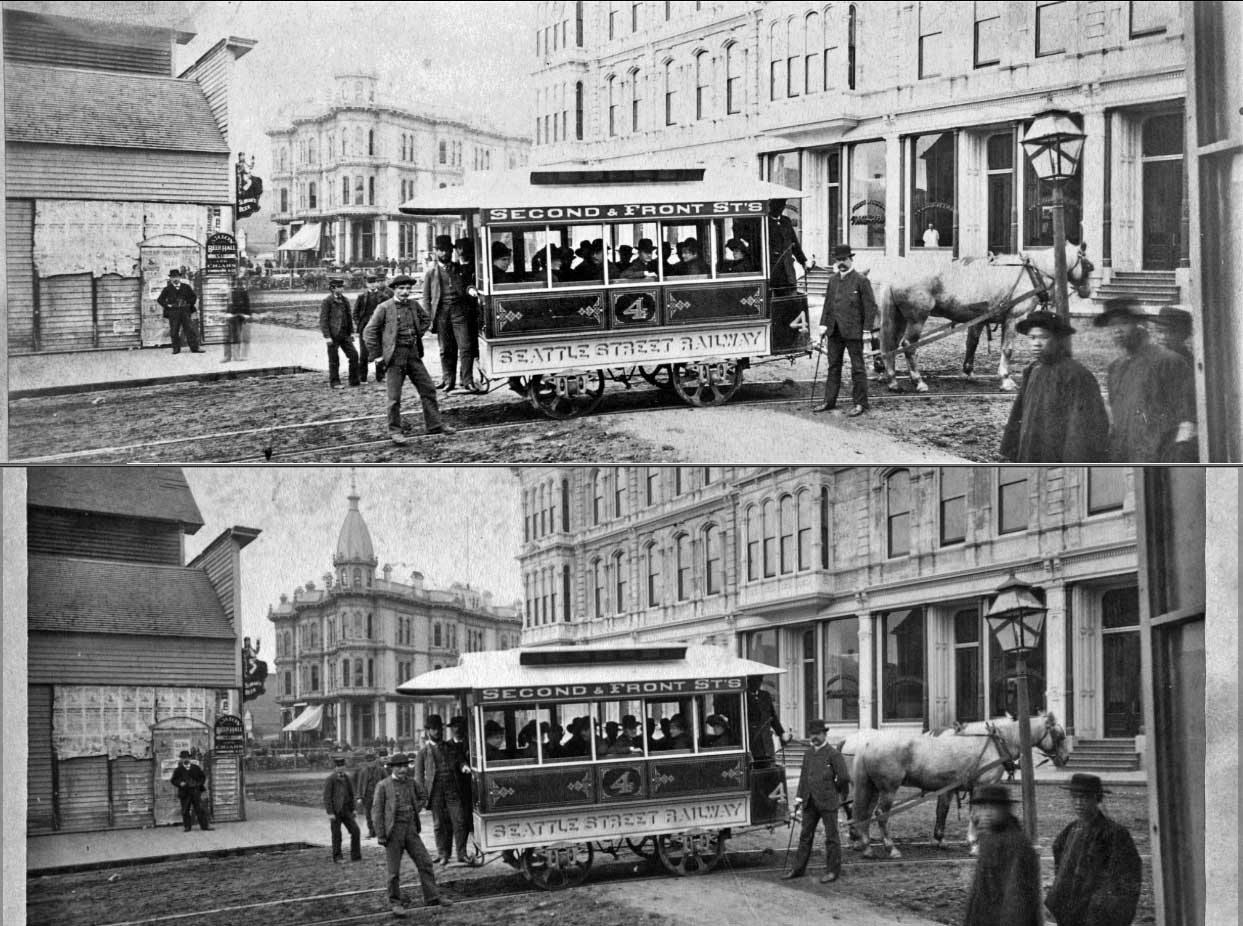 10. Horse-car-1884-Occidental-&-Mill-posing-2-versionsWEB September 21, 2014 1243 × 926 Seattle Now & Then: The Occidental Hotel Returning to the Occidental Hotel, here also photographed from Occidental Avenue, then still named Second Avenue. The date is 1884, the year for the beginning of Seattle’s horse-drawn trolley. (Courtesy, MOHAI)