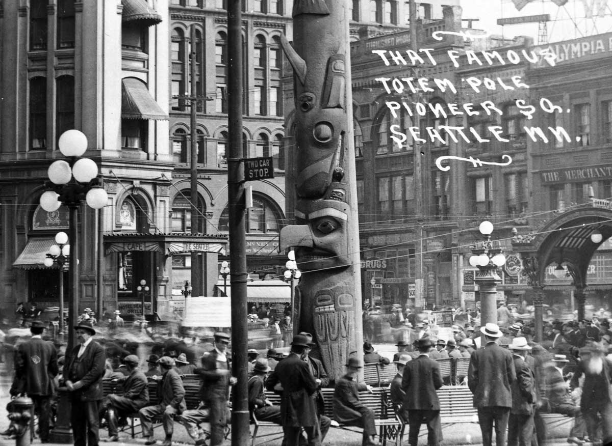 9.-Pioneer-Square-totem-bottomWEB September 21, 2014 1200 × 876 Seattle Now & Then: The Occidental Hotel Shall we add the Pioneer Square’s stolen totem pole eventually replace the flag pole. Here the slim front face of the Seattle Hotel, and its cafe, show to the left of the surely famous and infamous totem.