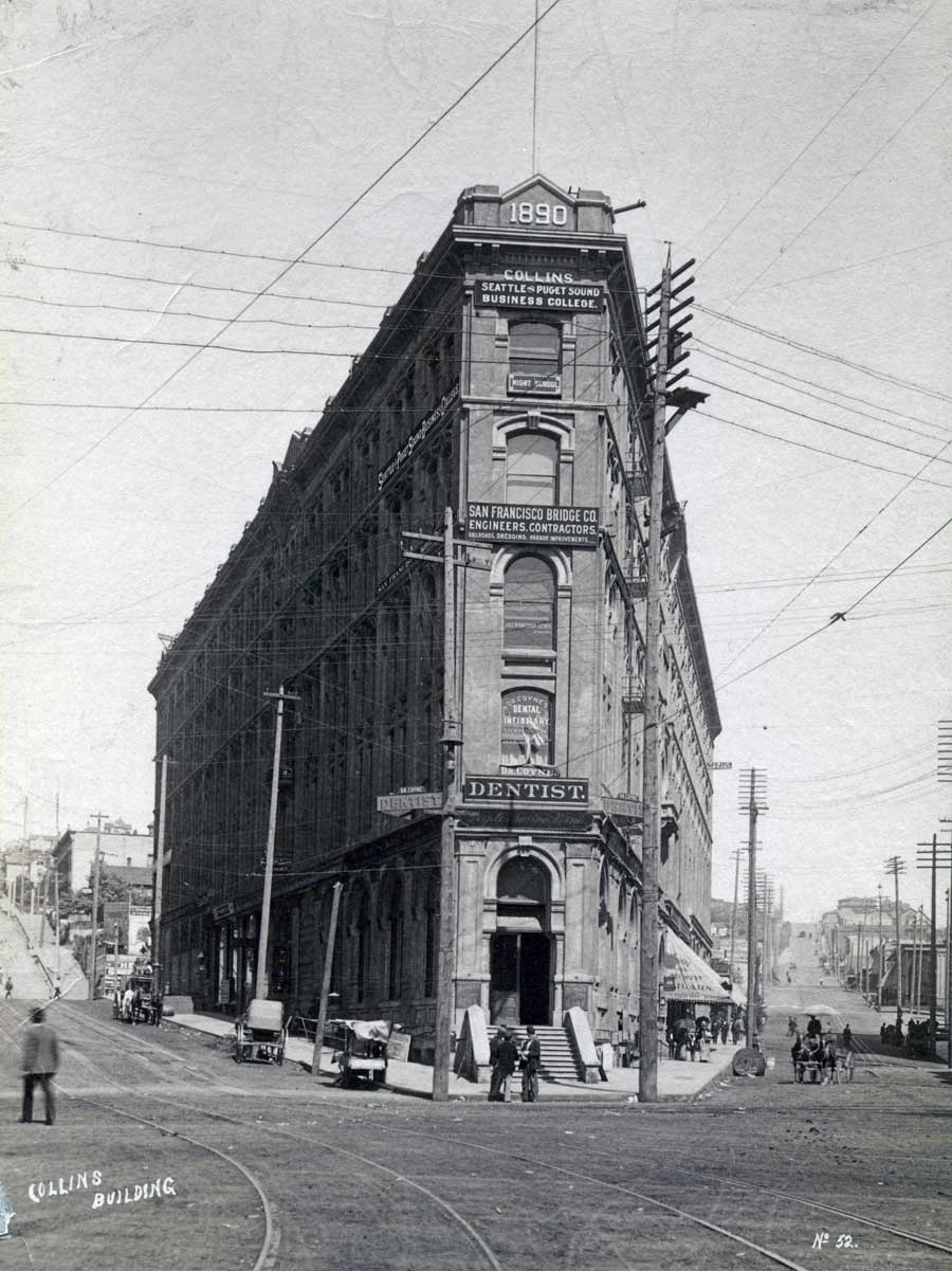 After the fire of 1889 Collins raised this namesake business and hotel block. The economic crash of 1893 had him selling office spaces cheap, for the building would not support a hotel – until the beginning of the gold rush in 1897. Collins then changed the name to Seattle Hotel.