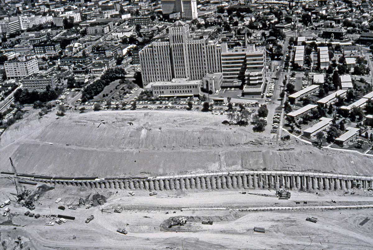 Harborview during freeway construction. The work required exceptional measures to hold First Hill – aka Yesler Hill, Profanity Hill, Pill Hill – in place because of its hydraulics or fluid dynamics: the springs that the first settlers found so appealing.
