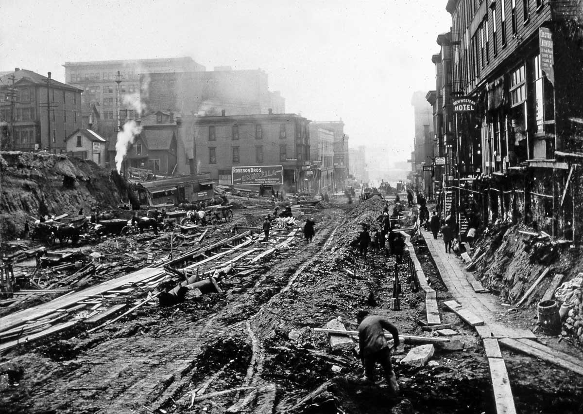 X.-3rd-ave-regrade-s-fm-MarionWEB October 12, 2014 1200 × 851 Seattle Now & Then: Third Avenue Regrade The steam shovel on the left seems to be cutting into bluff for the Trust company’s Central Building. This look south on Third Ave. was taken from the pedestrian overpass on Marion, seen twice above.