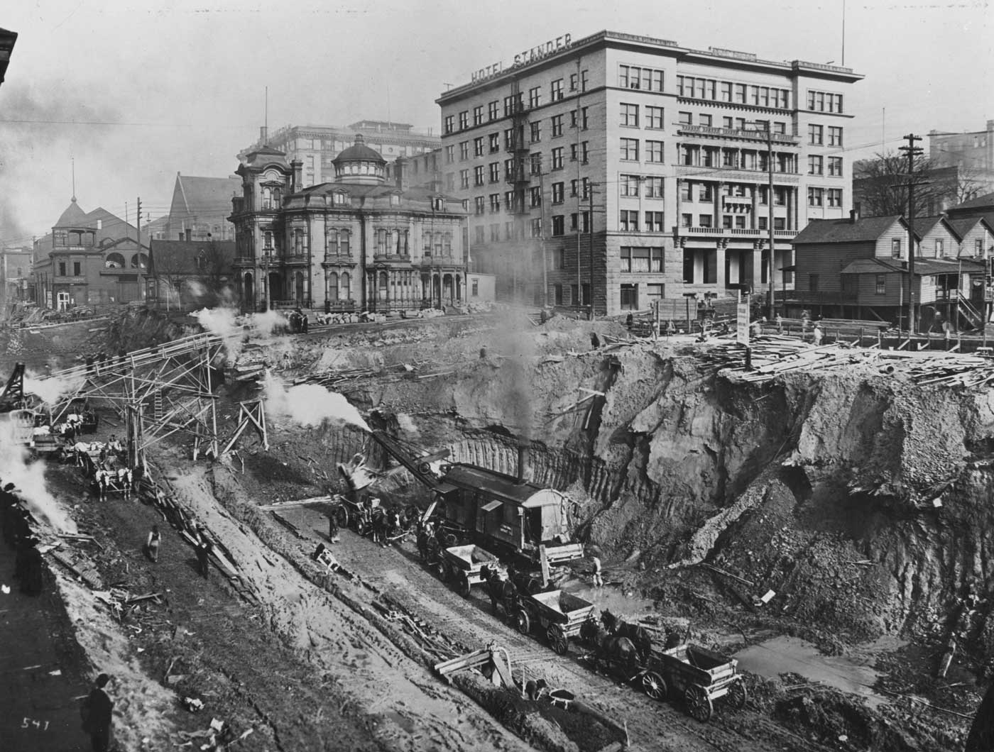 The Third Ave. regrade with the Marion Street pedestrian trestle on the left, the Stacy mansion, left of center, and the Standler Hotel, right of center. Foundation work for the Central Building has yet to begin. Note the Third Ave. Theatre with its full top, far-left.