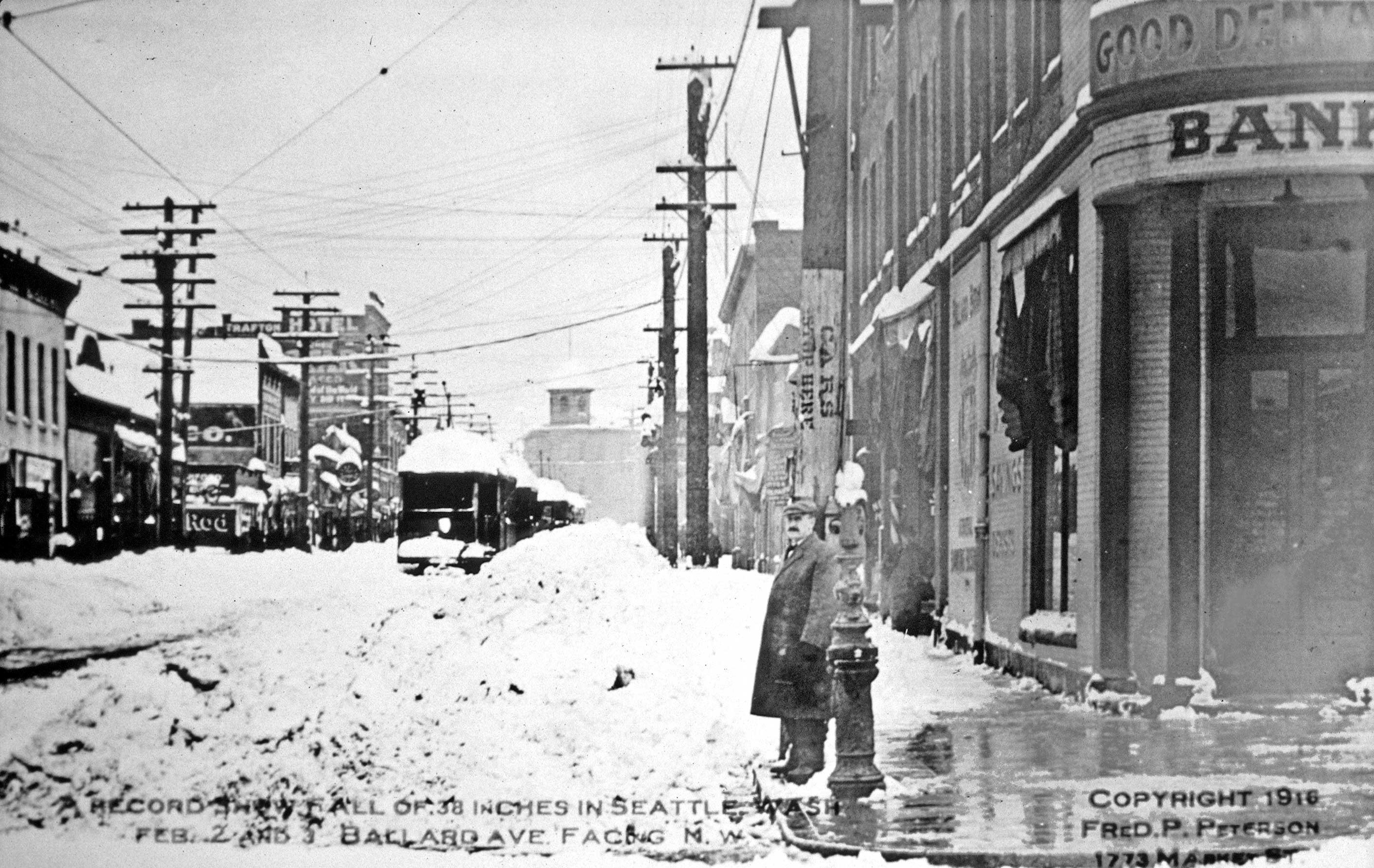 z-BallardAve-1916-Snow-WEB October 19, 2014 2825 × 1785 Seattle Now & Then: Leary Way An look northwest on the mostly brick Ballard Avenue during the 1916 Big Snow.