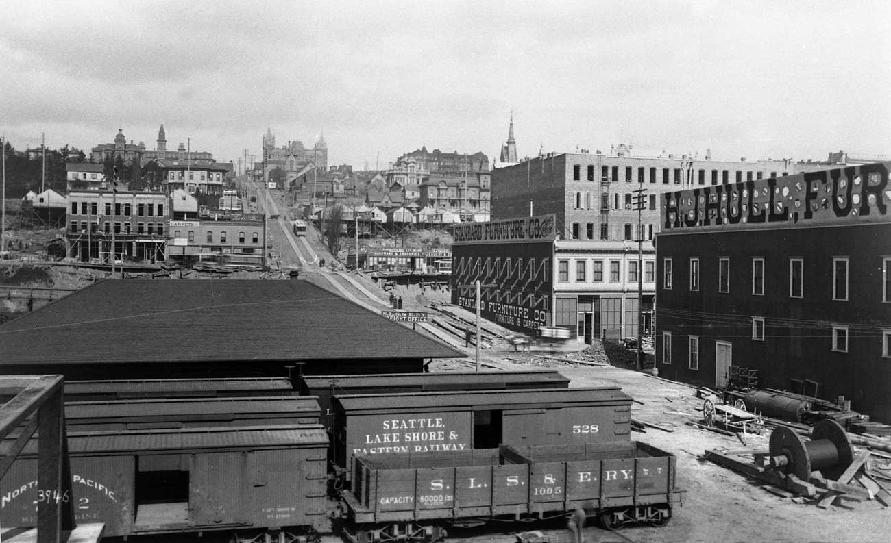 Haynes-lk-fm-Coal-Bunkers-up-Madison-WEB October 26, 2014 1300 × 793 Seattle Now & Then: On the Waterfront The Northern Pacific photographer F.J.Haynes look east up Madison Street from the coal trestle that passed over Railroad Avenue to the coal pier at the foot of Madison. (Courtesy, Tacoma Public Library)