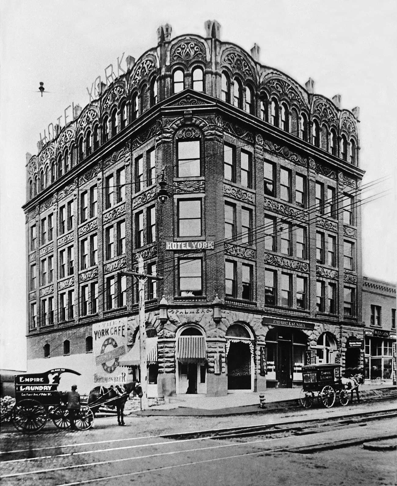 Hotel-York-THEN-mr November 15, 2014 1300 × 1589 Seattle Now & Then: The Hotel York THEN: The Hotel York at the northwest corner of Pike Street and First Avenue supplied beds on the American Plan for travelers and rooms for traveling hucksters. (Courtesy Lawton Gowey)