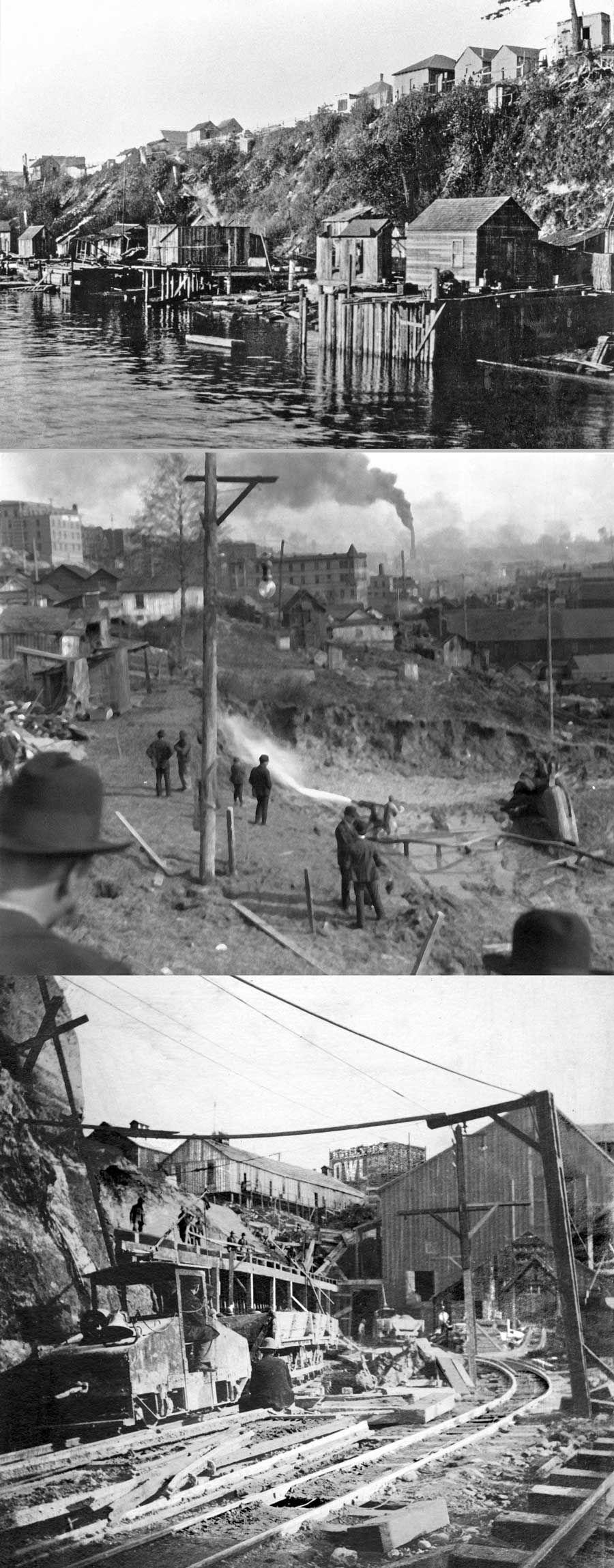 Sheds on the waterfront and above it on the bluff near the foot of Lenora Street. – Water cannons carving the cliff for construction of the tunnels north portal near the foot of Virginia Street, 1903. – Looking down the tracks from Railroad Avenue to the tunnel construction at the North Portal.