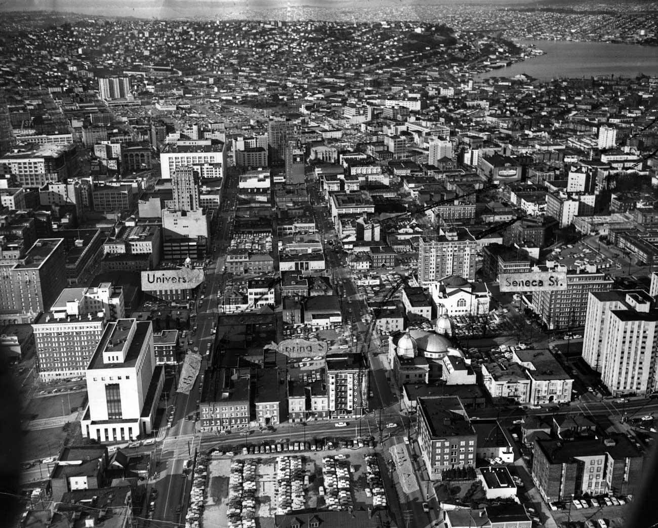 An aerial of the future freeway route through the Central Business District, including planned freeway’s curve to the northeast north of Spring Street. The curve that will cut through the southeast corner of Seneca and 7th Avenue was marked here near the center by someone long ago. (Courtesy, Ron Edge)