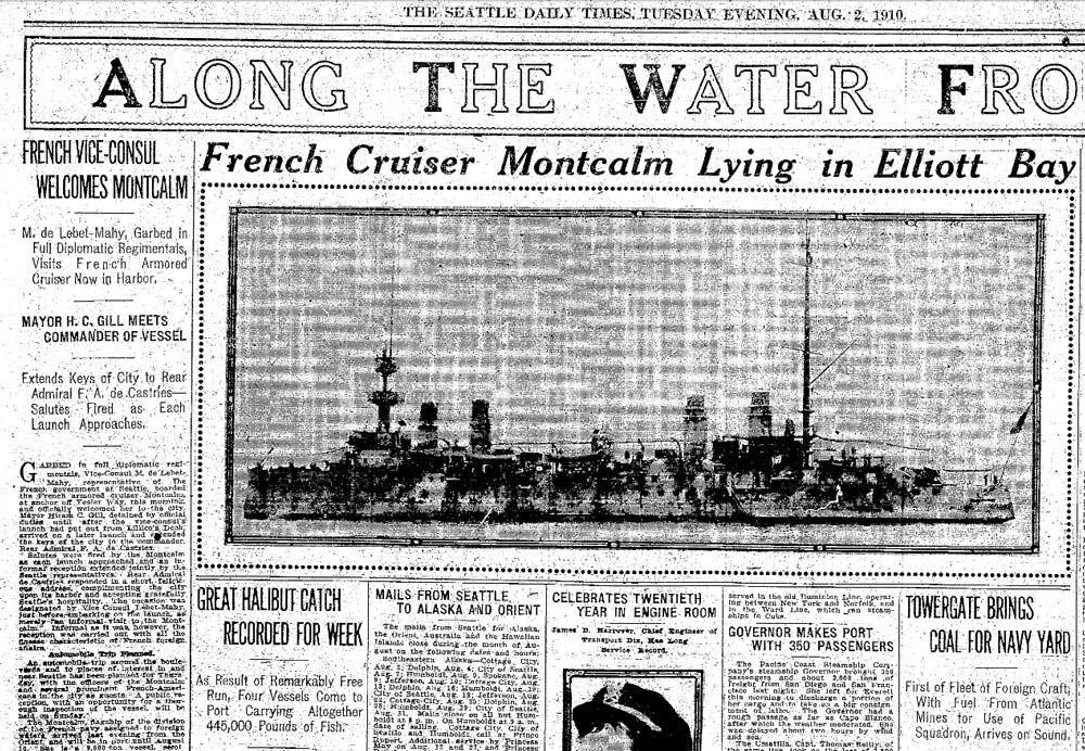 ST-Aug-2,-1910-French-Cruiser-visit-Elliott-Bay-w-WEB November 30, 2014 1000 × 692 THE BARK MONTCALM ADDENDUM Two months before “our” Montcalm visits Elliott Bay another French Montcalm called on us and stayed and partied long enough to qualify as a floating embassy.