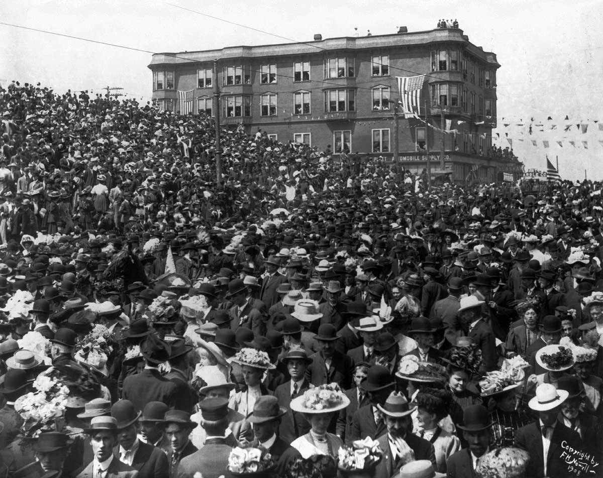 Seattle-large-crowd-on-2nd-Ave-1908-WEB December 13, 2014 1200 × 952 Seattle Now & Then: 1st and Virginia and an invitation! Date 1908, bottom-right corner, this view looks north from near Stewart Street at the crowds probably gathered to witness the parade celebrating the 1908 visit of the “Great White Fleet” to Puget Sound.
