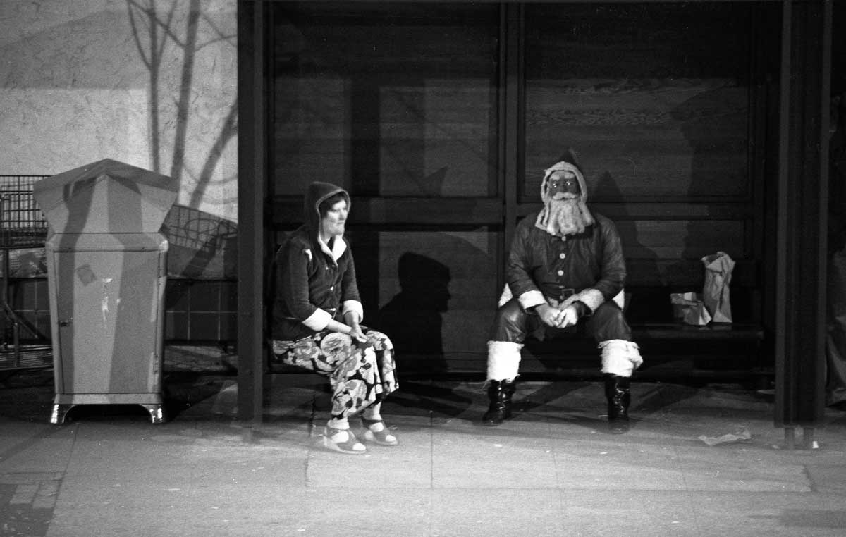 Worst-Santa December 13, 2014 1200 × 762 Seattle Now & Then: 1st and Virginia and an invitation! Terrifying Santa at Seattle bus stop. Paul Dorpat, 1976