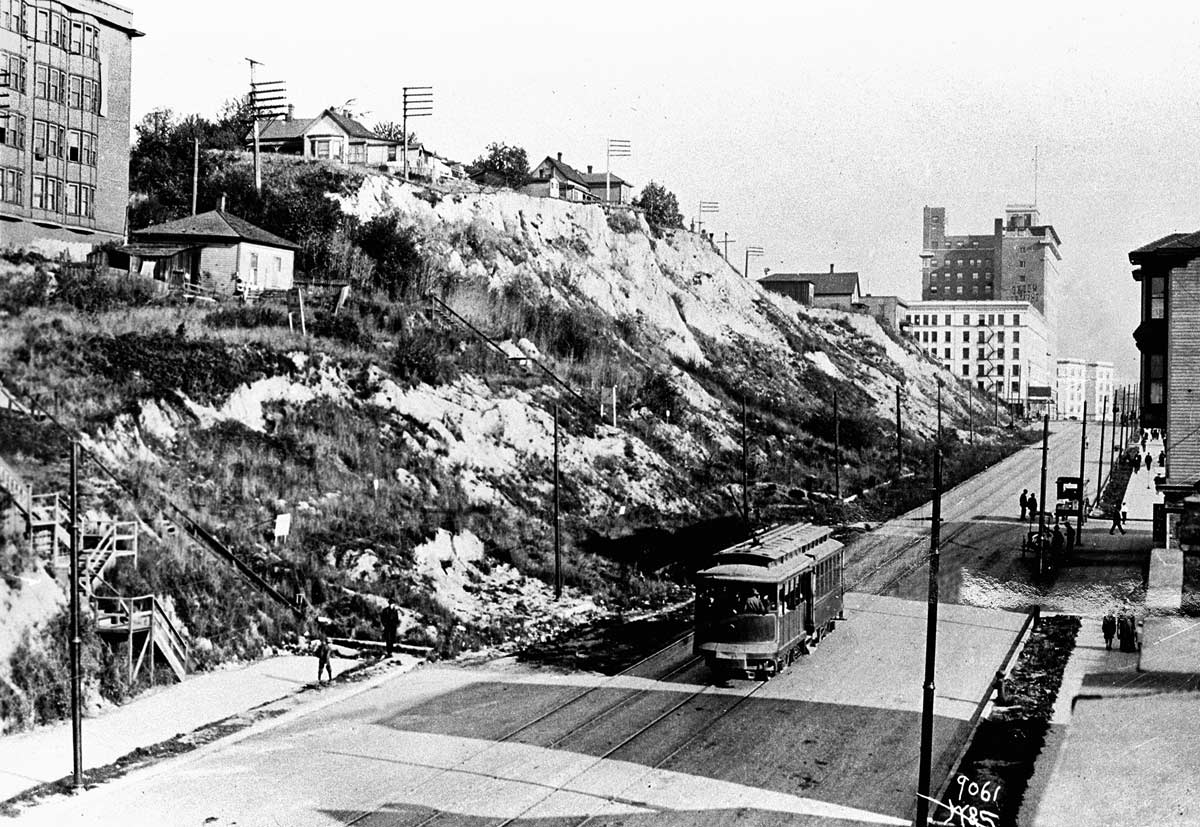 x Second-Ave-cliff-n-fm-Bell-ca.-1907-WEB December 13, 2014 1200 × 827 Seattle Now & Then: 1st and Virginia and an invitation! The cliff along the east side of Second Avenue, looking south from near Bell Street. The Moore Theatre and beyond it the New Washington Hotel are evident beyond Virginia Street.